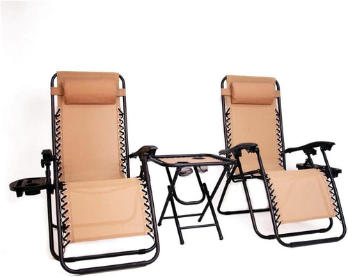 3PCS Zero Gravity Foldable Chair Portable Side Table Set Adjustable Recliner Pillow Chaise Lounge Outdoor Camping Patio Beach Garden Cup Holder BeigeCC5045BGS-2
